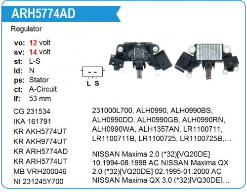![]() ARH5774AD Регулятор генератора Nissan | ||||||